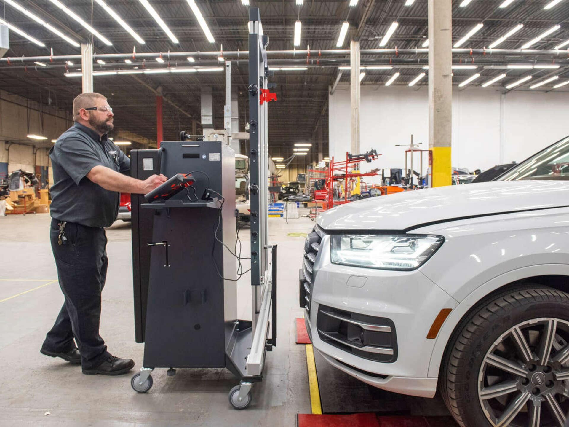 Technician operating Bosch DAS 3000 Static Calibration Fixture in front of vehicle at auto shop, showing ADAS setup process.
